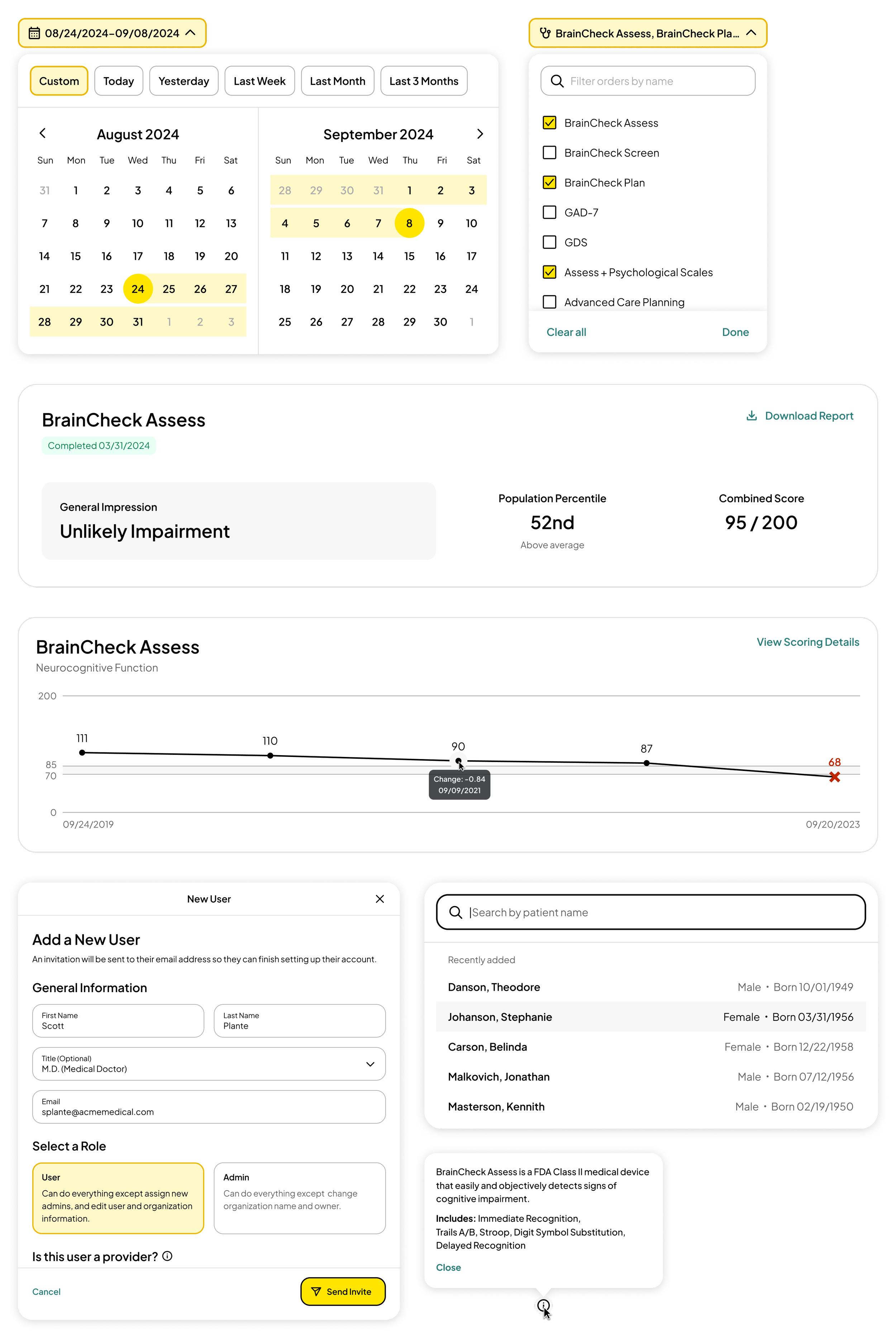 This project took place alongside BrainCheck’s full brand refresh, which introduced uncertainty early in the design process. To ensure alignment, I collaborated closely with our branding agency, regularly reviewing their marketing work to extract visual cues that could inform the product design system. Early communication and thoughtful adaptation of brand elements for a SaaS context were key to creating a cohesive and unified brand and product experience.