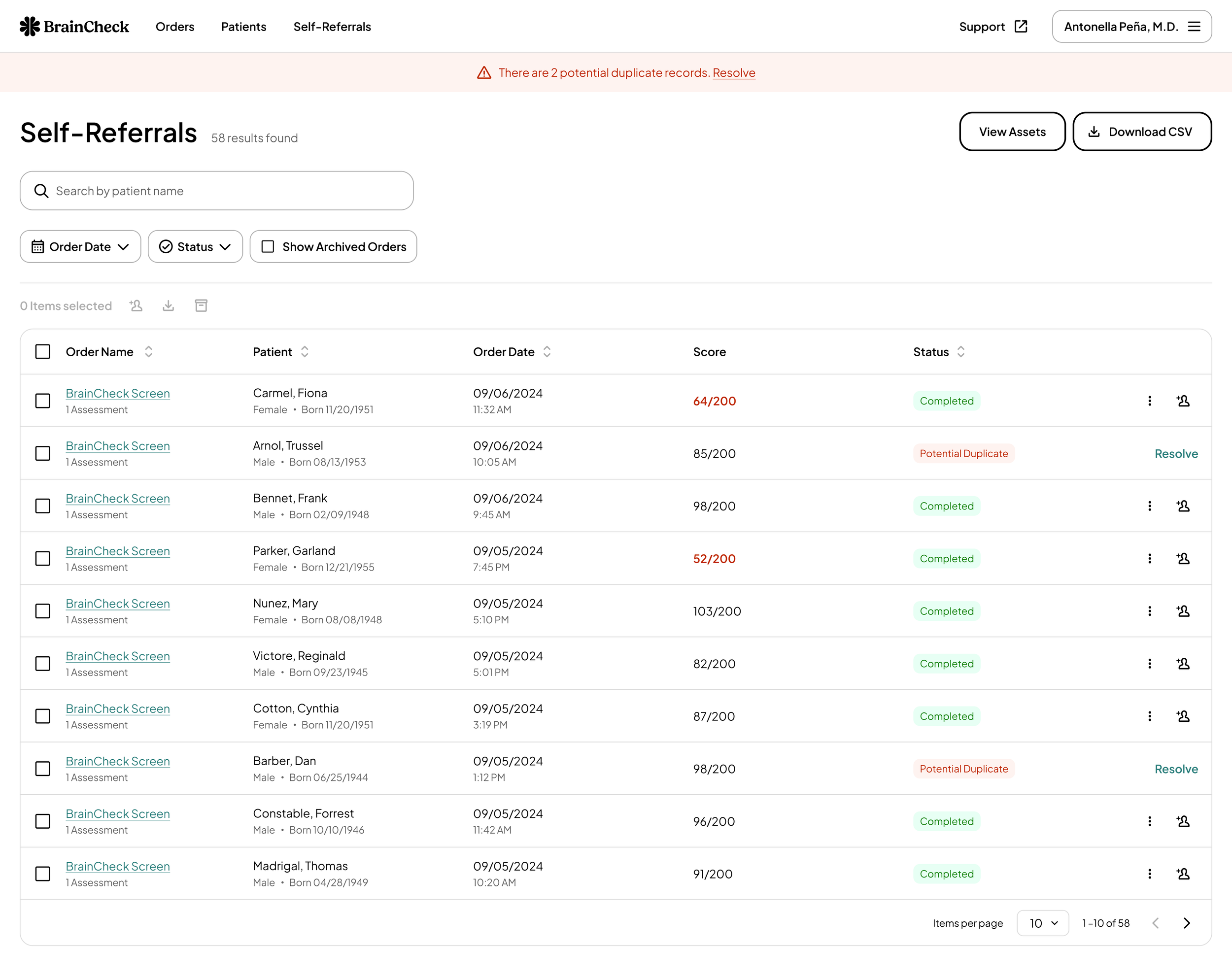 Patients can complete a cognitive screening using their provider’s unique BrainCheck Screen link and view their results immediately. These results appear in the organization’s Self-Referrals table. If the patient information matches an existing record, the assessment is automatically imported into the provider’s system. For new patients, results can be audited, imported, or merged with existing records to maintain data accuracy and integrity.