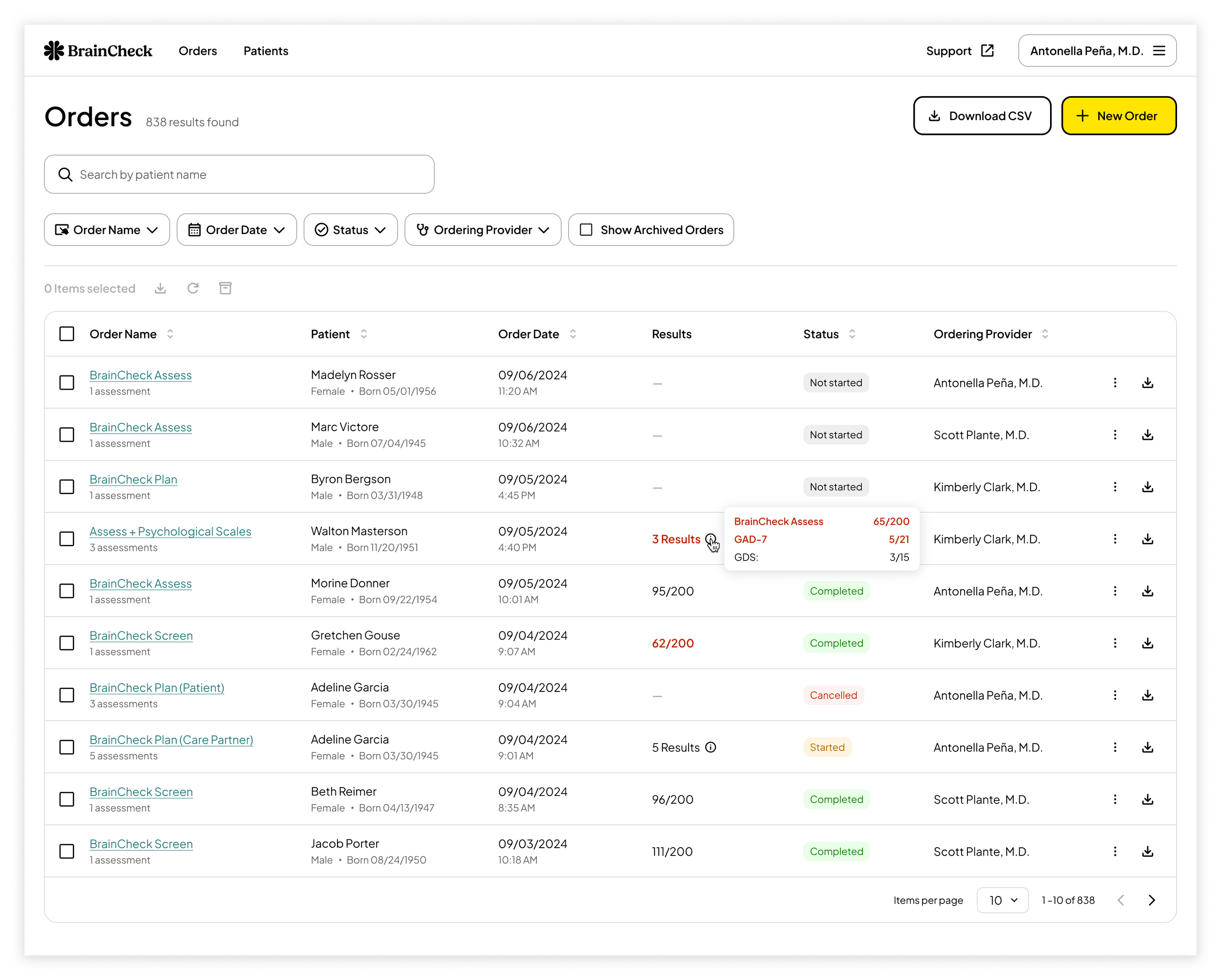 Previously, when a patient completed a bundle of assessments, each individual result appeared as a separate row in the orders table. Clinicians found it frustrating that they couldn't easily view bundled assessments together. Consolidating results and providing structured snapshots made it easier for doctors to analyze a patient’s overall performance.
