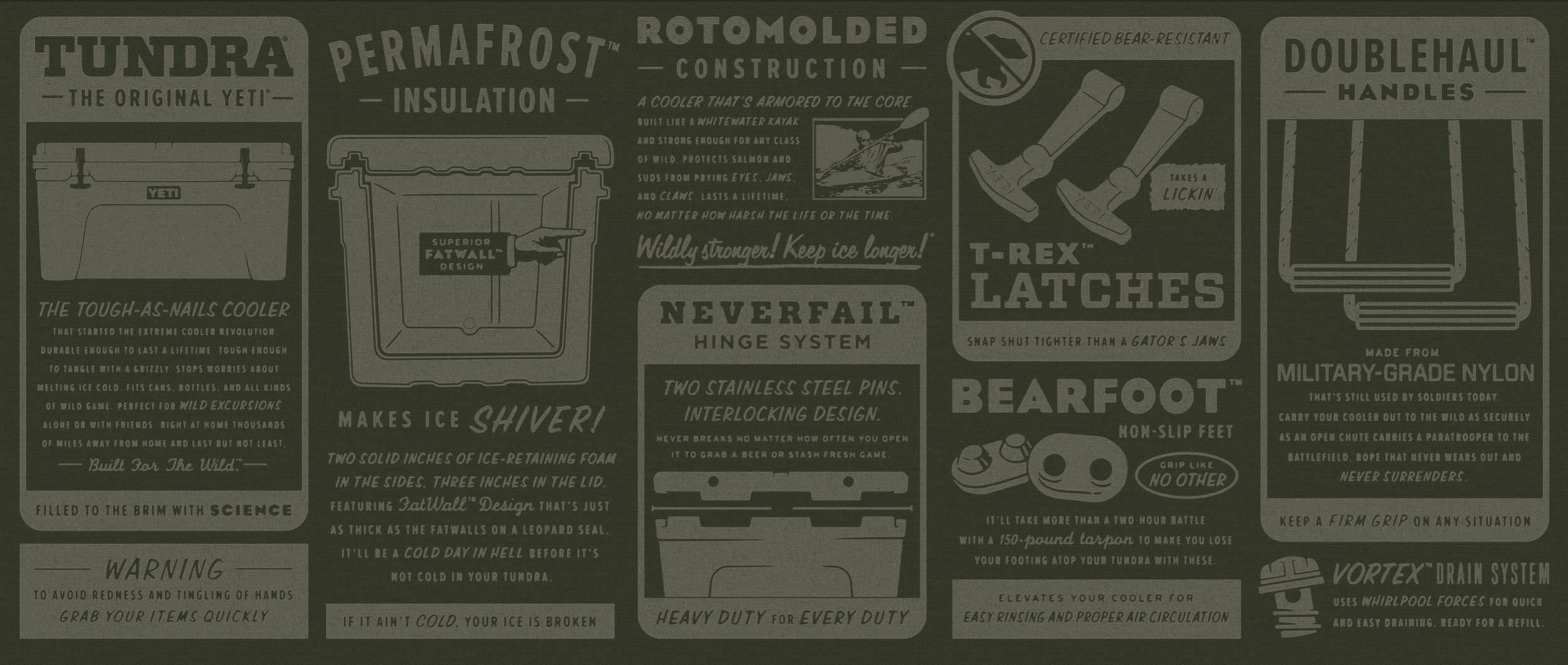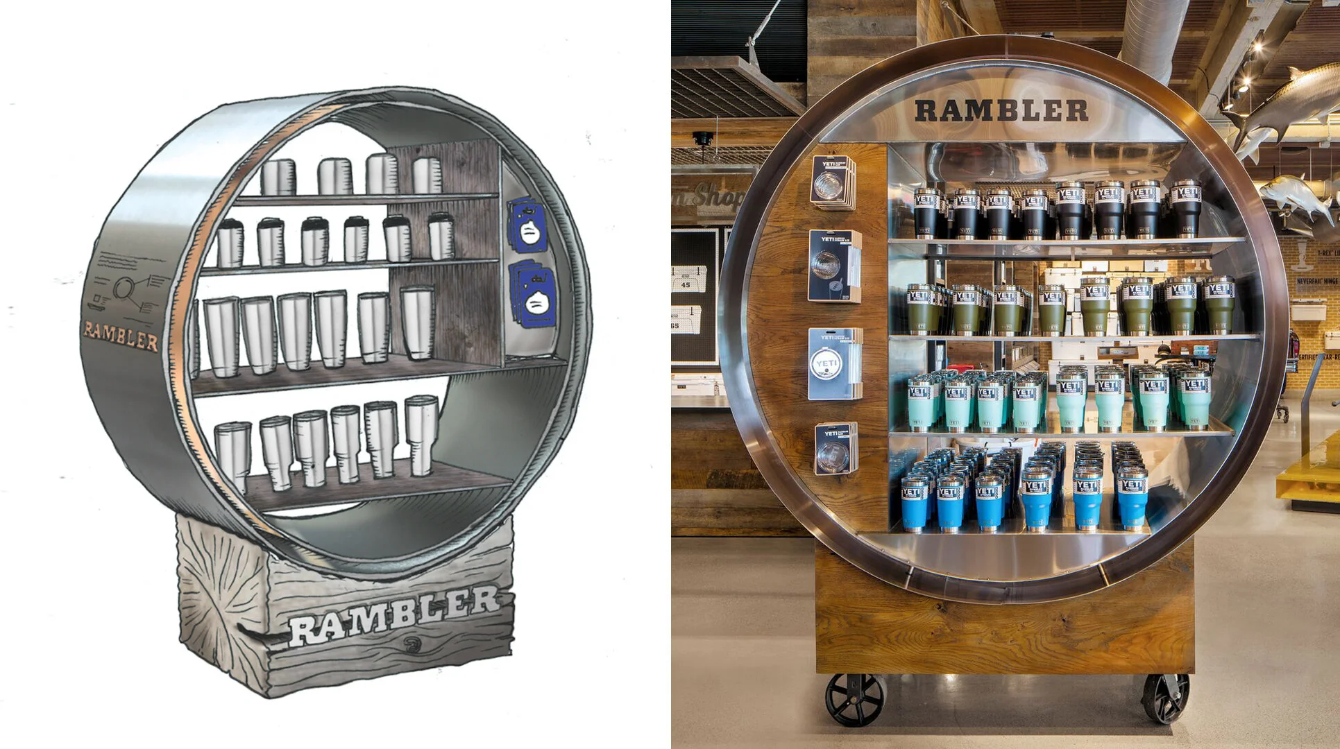 I worked alongside several designers, art directors, writers and builders to design this space. I was responsible for contributing to the general concept, sketching designs and mid-fidelity mockups of custom fixtures, wayfinding & product signage, custom typography, choosing materials and finding artists to paint a mural that represented the YETI brand.